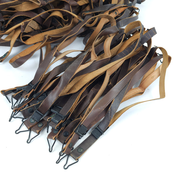 These are original U.S. M1 helmet leather chinstraps from the early 1960s, just before the military phased leather chinstraps out completely. They feature the correct dark russet leather with black metal cam buckle and black triangle ends. All examples are used originals in good, serviceable condition, with natural wear from age and storage. Each strap has been hand-checked to ensure it is still strong and suitable for installation on a liner. These are best suited for helmets that show honest use — not a mint display piece, and not a completely beat battle relic either. Sold individually, and quantities are limited.