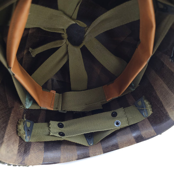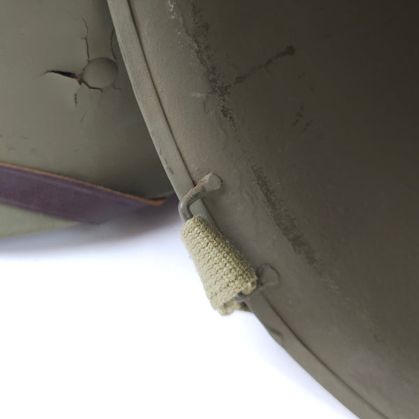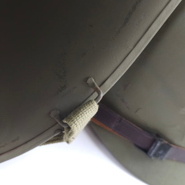 The liners are original WWII production as well. They were repainted only and still retain their original webbing and hardware. The webbing and the -A- washer hardware will show typical age and wear, and the repaint can have chipping or flaking from long-term temperature fluctuations, but everything is serviceable and performs as intended. Each liner was fitted with an original French M51 leather chinstrap during the restoration period, and that strap is included. Because they were stored without a headband or neckband, we finished the liners with our own.