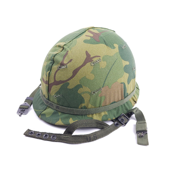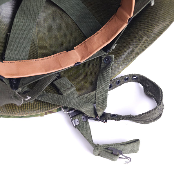 Our Type II Vietnam War M1 helmet is a complete paratrooper setup built with predominantly genuine U.S. GI-issue components. The helmet itself is 60s issue and has a set of original chinstraps. The liner features a three-point neckband (dated 1972), a matching headband (1972), a chin cup with the U.S. stamp, and the liner is in excellent used condition, dated 1967.
